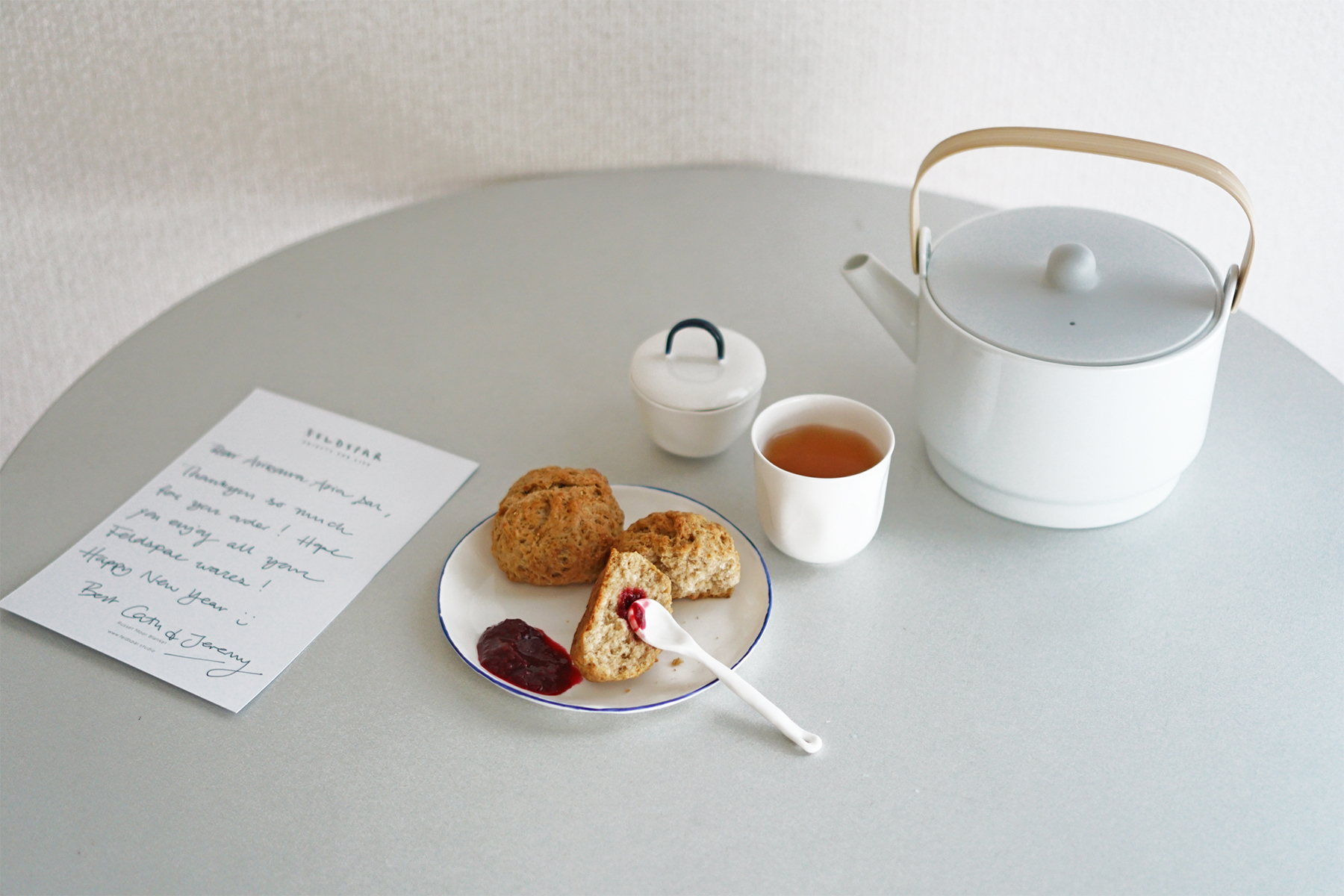 大好きなSHOZO COFFEE STORE(表参道Aoの裏に去年10月にオープンした北青山の新店舗。昨日は今年最初の営業日だったようで、代わる代わる店を訪れるお客さんは口々に「今年もよろしくお願いします」と新年の挨拶を交わしていた。居場所になるコーヒーショップ。)の全粒粉のスコーンに、ファーマーズマーケットで買った低糖のきゅうっと甘酸っぱいラズベリージャム。ティーポットは、1616/arita japanのTea Light。今年もオブジェ蒐集は続く…